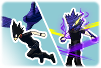 深淵闇躯(ブラックアンク)短押しで【黒影(ダークシャドウ)】を自身の体に纏わせる 発動中は 格闘攻撃と移動性能が強化される 再入力か “個性”技の使用で解除される |